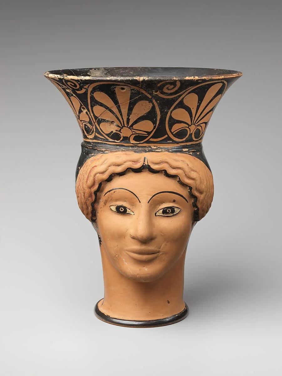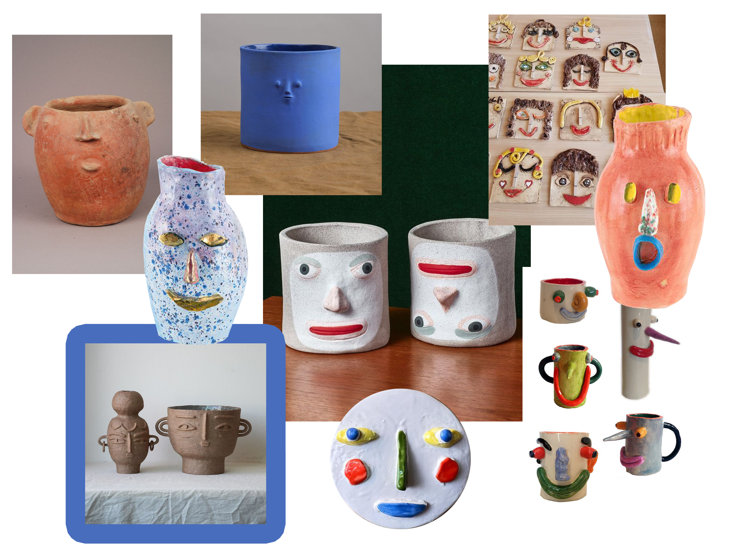 Like pinch pots vases with faces on them date back to ancient times and across the globe. The vase on the left is from 500 B.C. Greece, the middle is by New York designer Jonathan Adler, and on the right is a vase from around 500 C.E. Peru.
